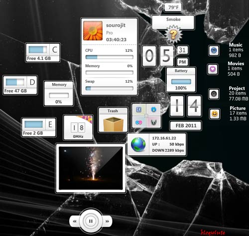 Snow Standalone Gadgets Pack is a freeware gadget pack for windows 7. This pack includes various beautiful gadgets that can be used. Some of this gadgets provide functionality like weather information, CPU usage details, calender, picture slide shows, Google news, space status of each drive, shortcuts to directly log in to facebook, twitter, deviantart and flickr accounts.
