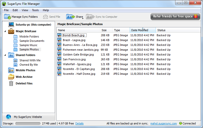 Backup, Synchronization and File sharing in one place with 5 GB free storage space of SugarSync account. You can store files, sync them on multiple devices and mobiles and share them publicly.